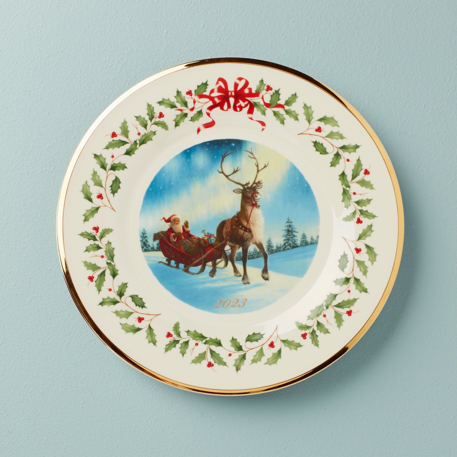 A must-have for the collector, this Holiday Plate features original artwork of Santa on his sleigh, pulled by a reindeer through a wintry wonderland. At the perimeter of the plate is our iconic holly leaf and berry motif with a golden 2023 at the center to commemorate the year.