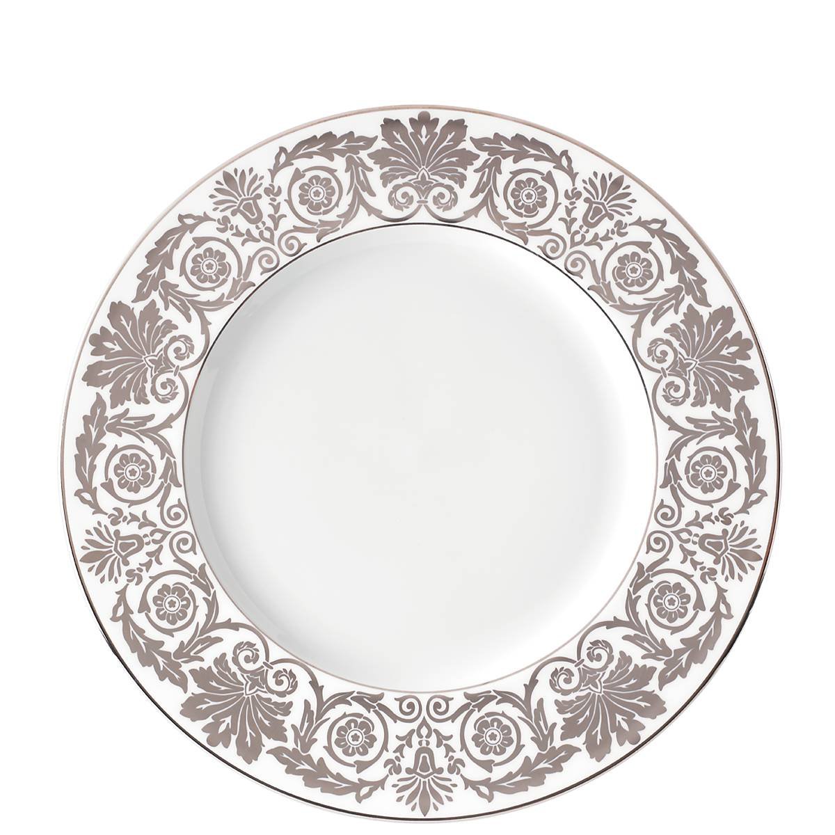 The Artemis 9 Accent Plate is at the height of elegant dinnerware collections. This durable bone china accent plate features a metallic, regal floral scroll design inside concentric circles of precious platinum accenting.