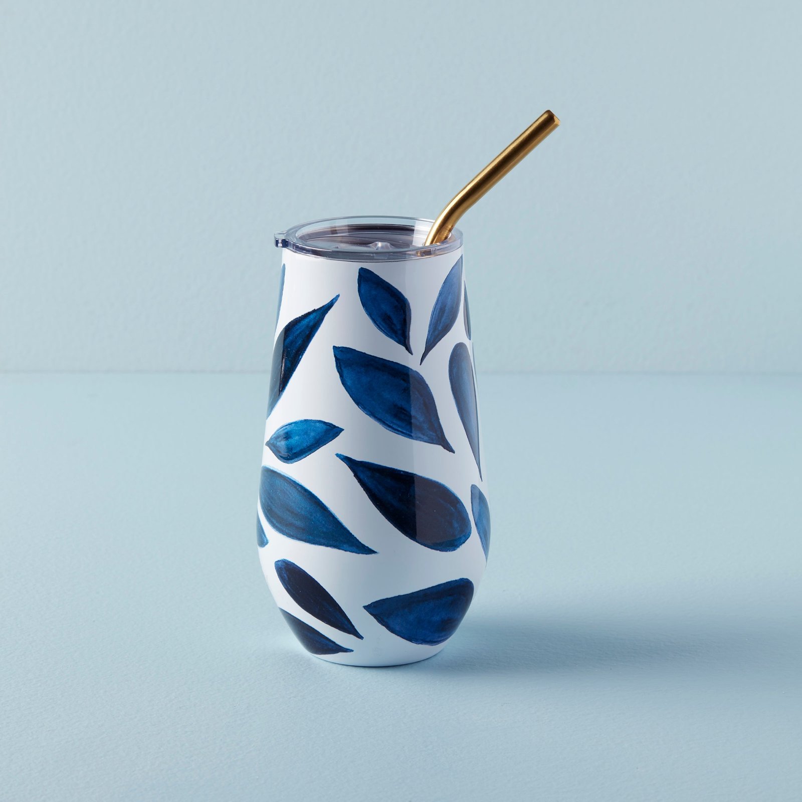 How refreshing! Detailed with a breezy Blue Bay leaf pattern, this leak-resistant, sweatproof, shatter-resistant wine tumbler keeps you sipping in style, outside, inside, anywhere! Featuring double-wall stainless steel construction and vacuum insulation, it keep hot drinks hot and cold drinks cold for longer. Clear BPA-free lid and coordinated stainless steel straw included.