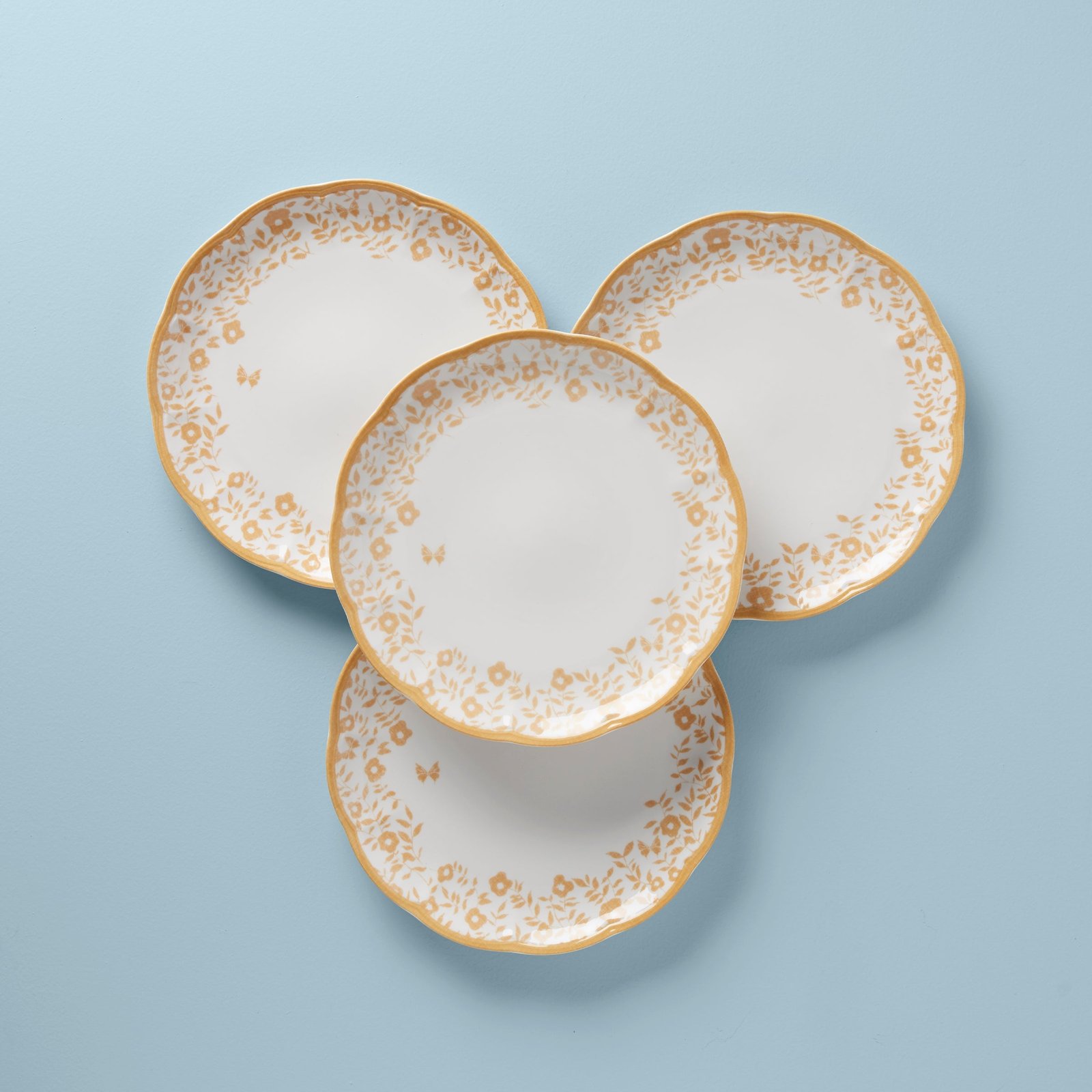 Lovely and lively, these plates feature flourishing natural motifs for a cottagecore aesthetic. Designed with a bold, bright goldenrod hue and smoothly scalloped edges with grandmillenial floral accents, they add warmth to your table.