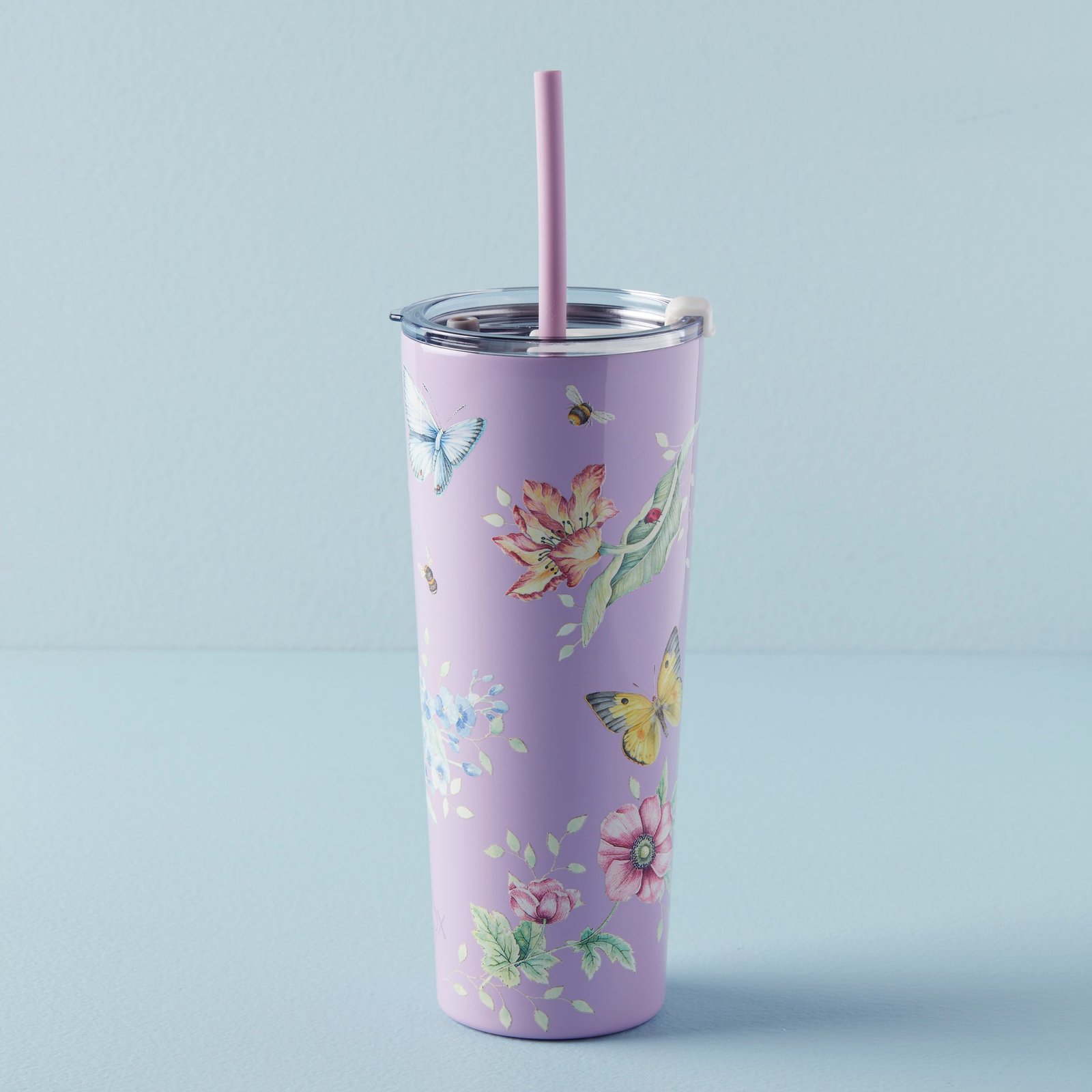 How refreshing! Detailed with a lavender Butterfly Meadow motif, this leak-resistant, sweatproof, shatter-resistant tumbler keeps you hydrated and stylish on the go. Featuring double-wall stainless steel construction and vacuum insulation, it keeps hot drinks hot and cold drinks cold for longer. Fitted, clear BPA-free lid and coordinated straw included.