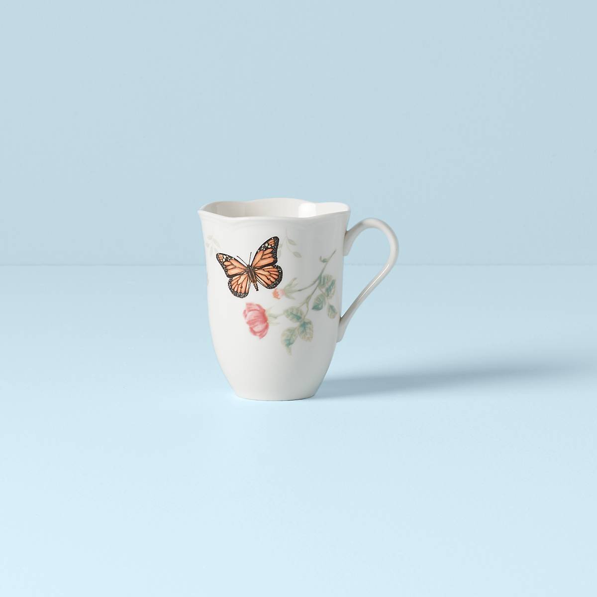 Lively blossoms tempt a colorful monarch butterfly amidst motifs of light-palate foliage. Crafted from durable ceramic porcelain with scalloped edges and a petite handle, the Butterfly Meadow Monarch Mug is dishwasher and microwave-safe for a charming and functional kitchen addition.
