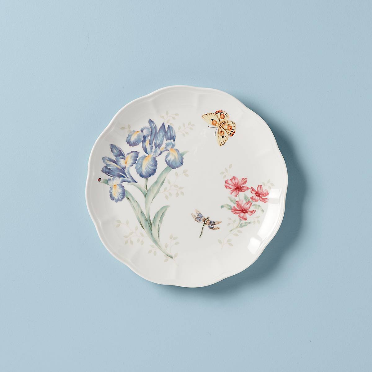 A springtime illustration plays out across this dinner plate’s surface with an airborne butterfly and Dragonfly and a ladybug traversing blooming flowers. Crafted from durable white ceramic porcelain with a lightly scalloped edge, the Butterfly Meadow Orange Sulphur Dinner Plate is dishwasher and microwave-safe.