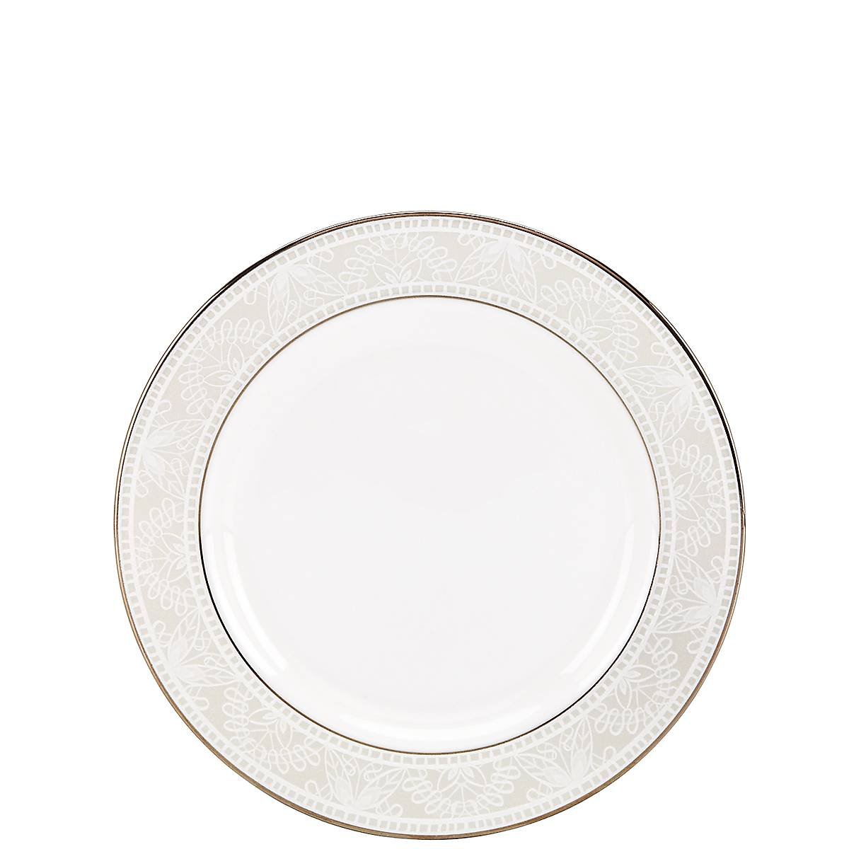 Delight future dinner guests with this chic new collection of durable white bone china. The Chapel Hill Bread Plate is trimmed with a delicate chantilly lace design, that evokes romance, whimsy and vintage wedding veils. This dish features accents in precious platinum, and is dishwasher-safe.