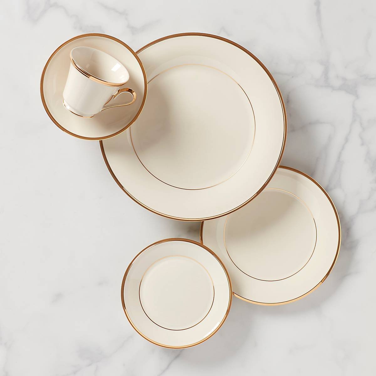 Shimmering with 24-karat gold accents along the outer and inner borders, this five-piece place setting, crafted of durable ivory porcelain, is a classic addition to any dining experience, and includes a cup and saucer. This item is dishwasher-safe, for added convenience.
