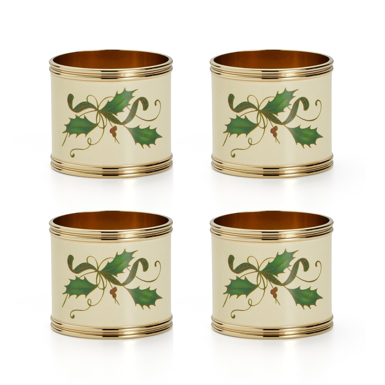 The table is set. The meal is done. Time for one last finishing touch: add these elegant napkin rings to your Christmas dinner place setting. Decorated in our classic holly leaf Holiday Nouveau pattern, this 4-piece set is topped off with a lovely gold finish at the top and bottom.