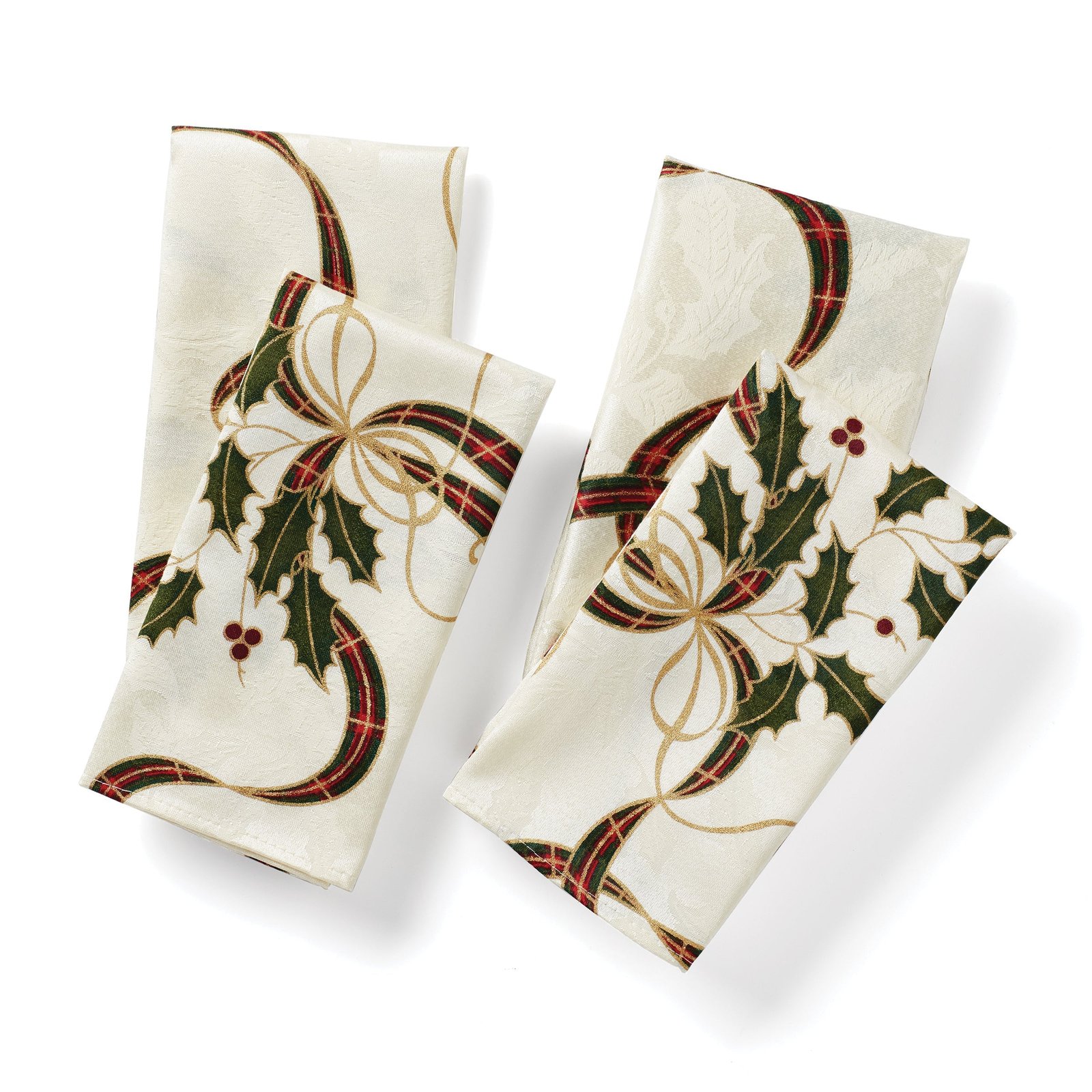 With effortless grace, the intricate design of these Holiday Nouveau Ribbon Napkins is an elegantly festive option to dress up any dining room table for the holiday season. This style has a subtle sheen, featuring printed tartan ribbons and holly leaf motifs.