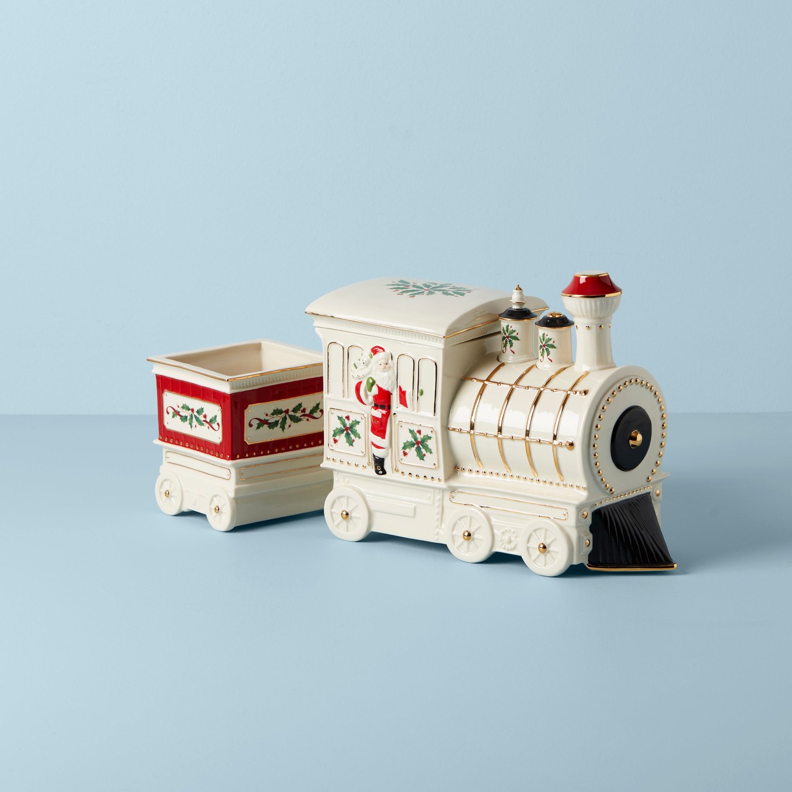 Detailed with our iconic holly and berry Holiday motif, this very merry figural train delivers extra cheer to your Christmas table. It’s a centerpiece and a table caddy in one! Store whatever you wish in the lidded compartment and separate caboose (napkins, flatware, snacks, you name it). And here’s a secret: an included salt and pepper shaker set are part of the design! (Spy them atop the front portion of the train.) For a touch of glam, gleaming gold accents shine with seasonal spirit.