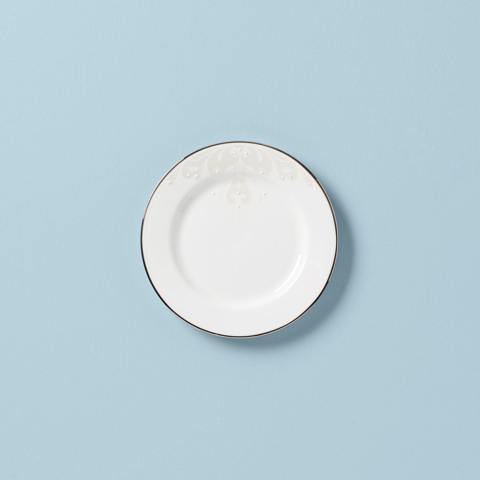 A shimmering scroll motif decorates the pristine white surface of this ornate and stylish Opal Innocence Scroll bread plate. This elegant and durable bone china plate is accented in precious 24k gold and is dishwasher safe for added convenience.