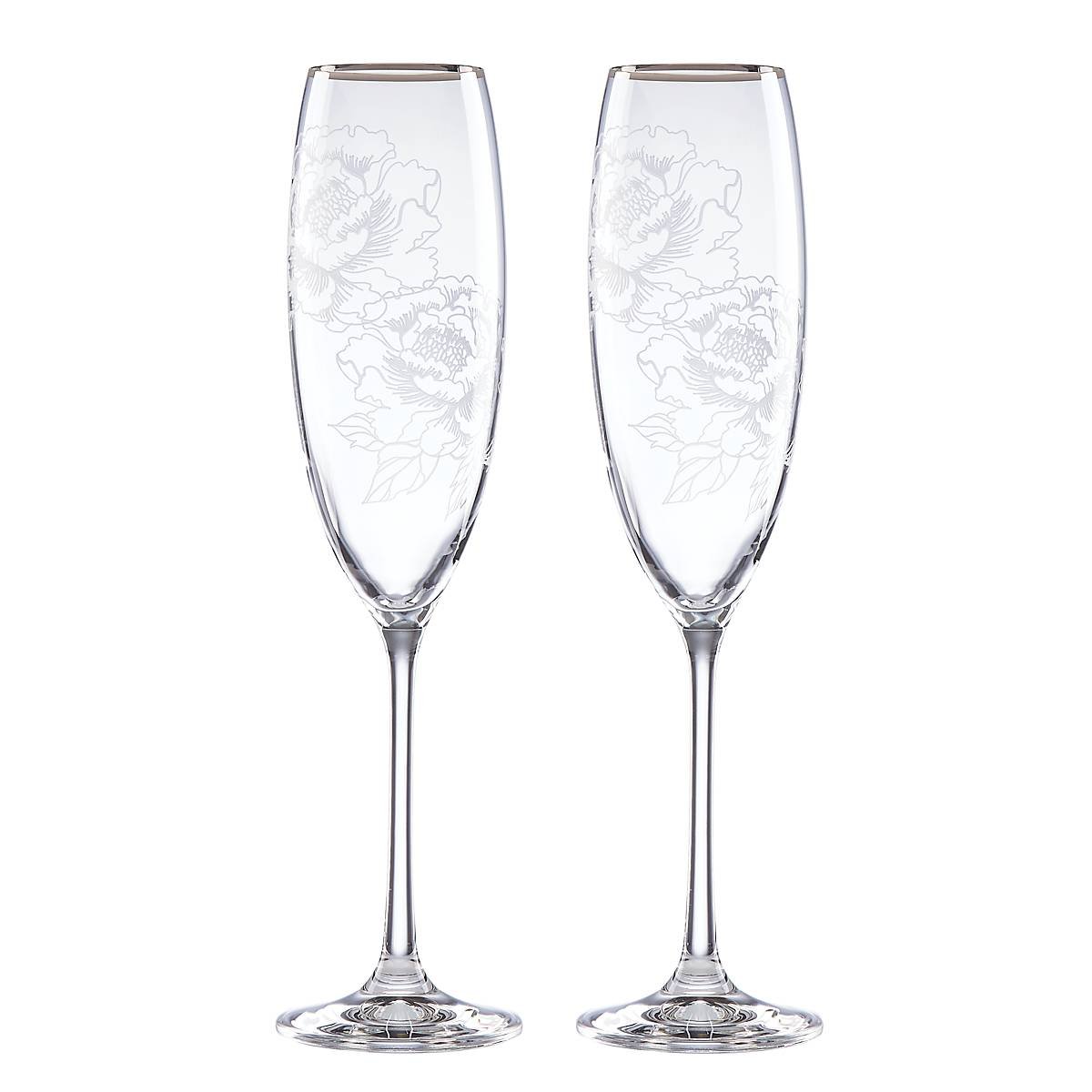 The regal and pristine Silver Peony Toasting Flutes are crafted from faultless crystal with platinum banding and peonies etched into the side. This item is the ideal piece to celebrate a special occasion.
