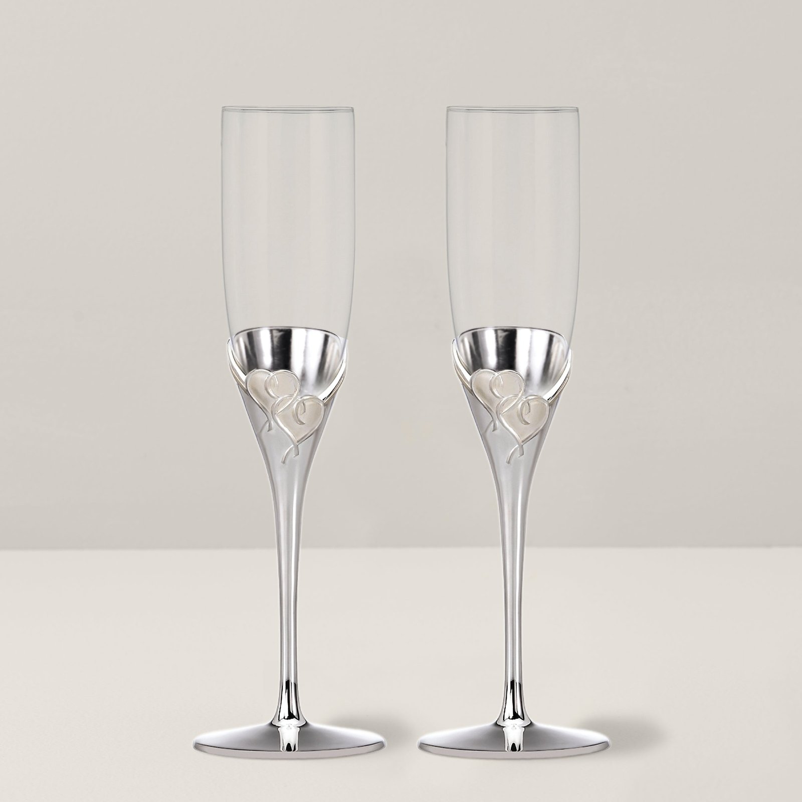 Raise a toast to romance with the True Love two-piece champagne flute set. Both flutes are silver-plated and feature the design of two interlaced hearts.