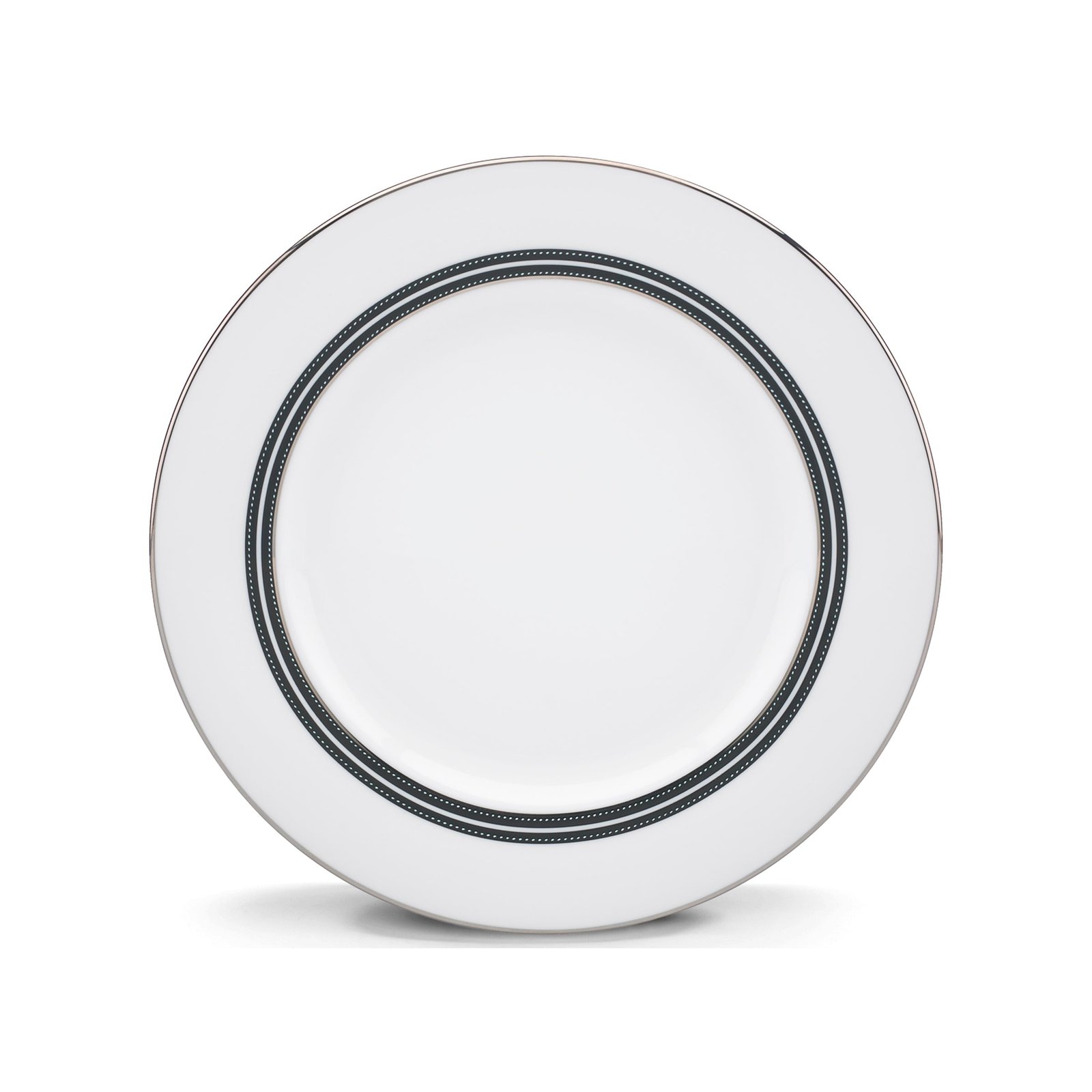 White raised stitches with black banding and platinum details give the kate spade new york Union Street Salad Plate a sophisticated look. This is chic bone china dinnerware, perfect for any occasion.