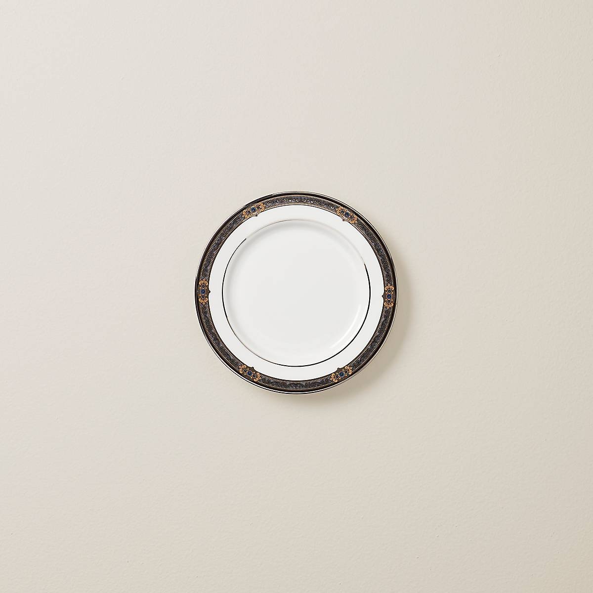 Featuring an elaborate enamel jeweled pattern of florals and scrolls along its border, this durable white bone china Vintage Jewel bread plate glitters with accents of 24-karat gold and platinum, making the piece an opulent choice for dining. This item is dishwasher-safe, for added convenience.