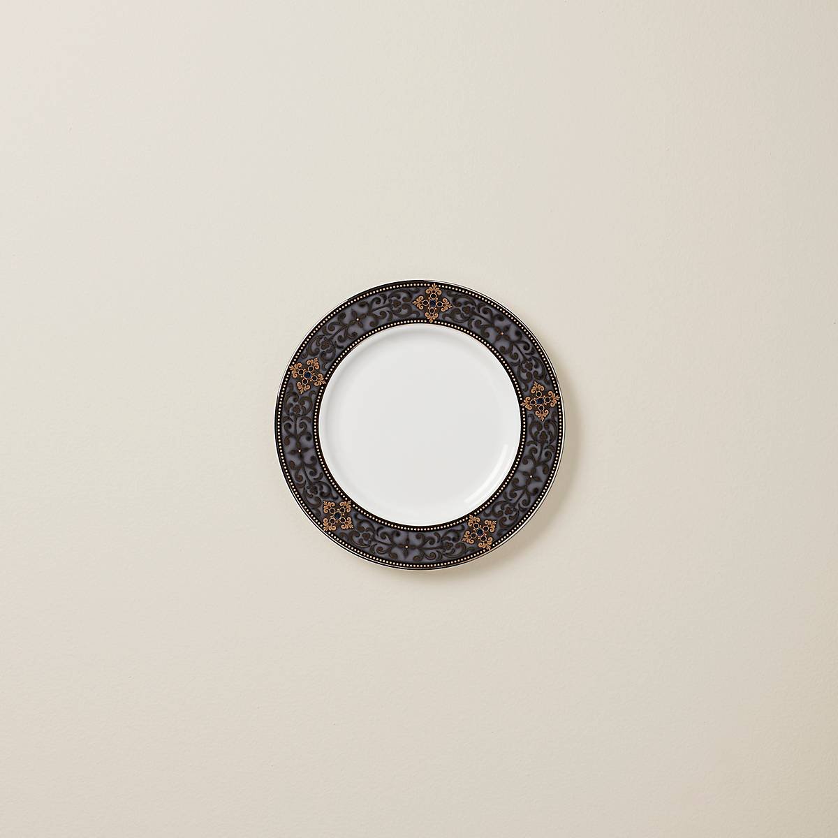 This Vintage Jewel salad plate, made of durable white bone china, features an ornate black-and-gold pattern of scrollwork along its border, as well as accents of 24-karat gold and precious platinum. The enamel dots gives the piece a fine texture. This item is dishwasher-safe, for added convenience.