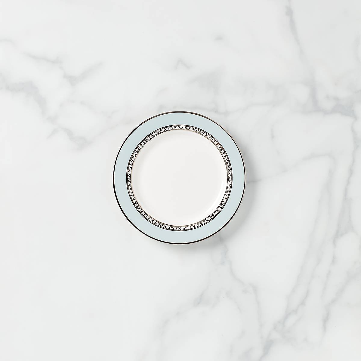 A sky blue border complements crisp white on this durable bone china bread plate, that includes a shimmering band of precious platinum and a floral pattern on the interior. This item is dishwasher-safe, for added convenience.