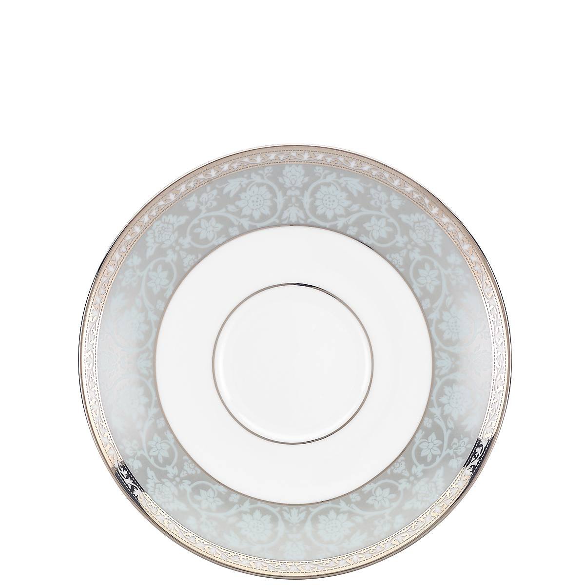 This saucer has a gentle glow with bands of precious platinum accents, against its durable white bone china exterior, as a stripe of light blue lace florals swirls along the border for a subtle texture and hint of color. This item is dishwasher-safe, for added convenience.