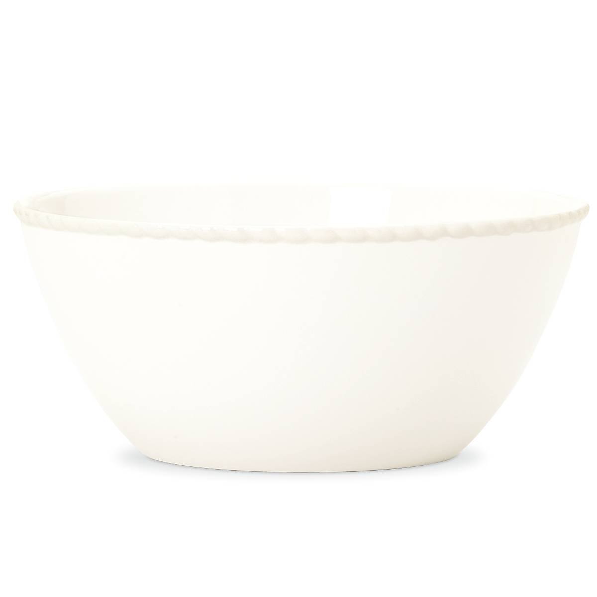 Timeliness with a subtle twist, the Wickford Collection is adorned with a textured rope motif. From Kate Spade New York, the Wickford Fruit Bowl is crafted of durable white ceramic porcelain, and is microwave and dishwasher-safe.