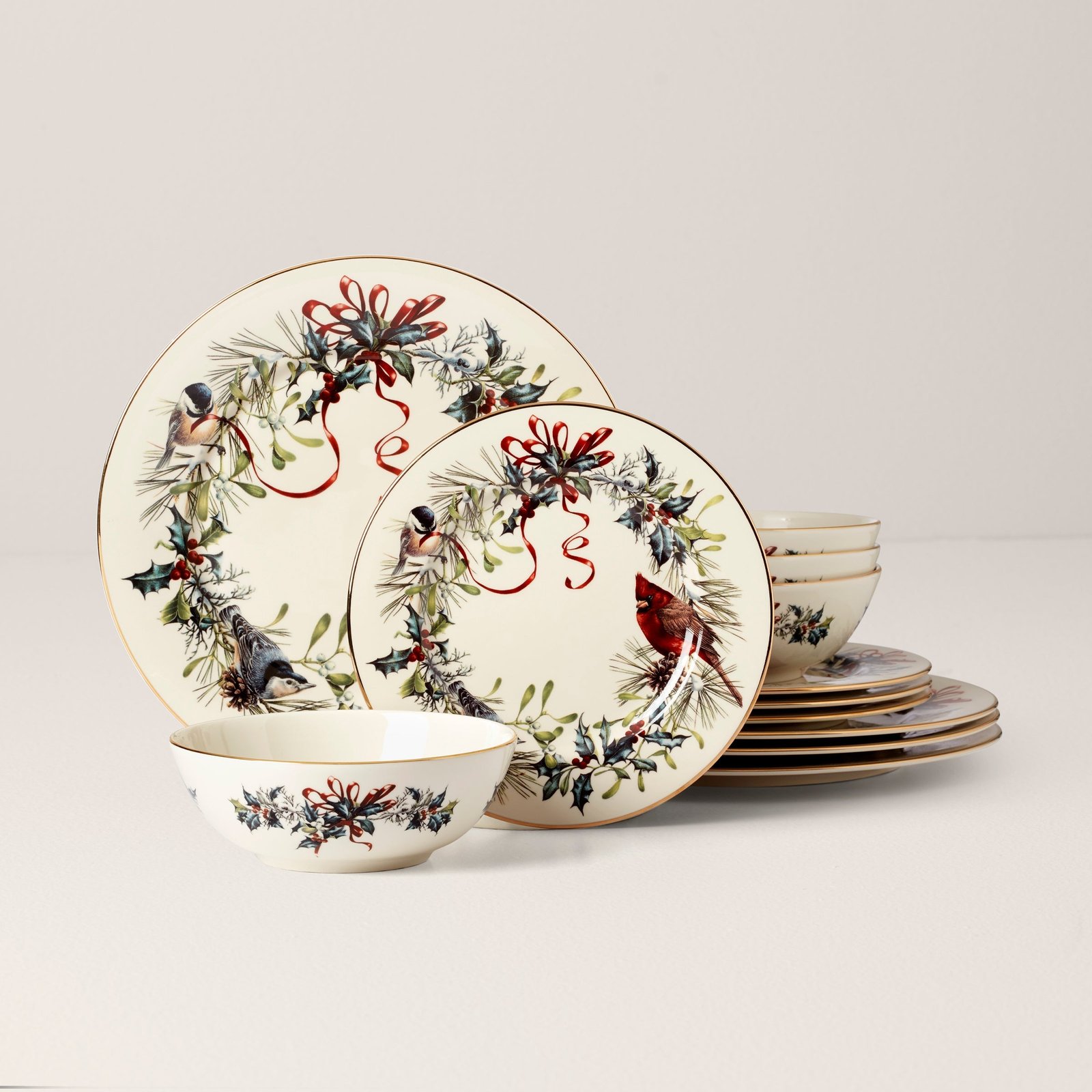 Our classic Winter Greetings Collection features peaceful birds perched amidst a motif of pinecone, holly, and mistletoe. Crafted from durable porcelain with 24k gold accents, this 12-piece dinnerware set makes an artful addition to the holiday tabletop. The service for four includes dinner plates, salad plates, and bowls for four people.